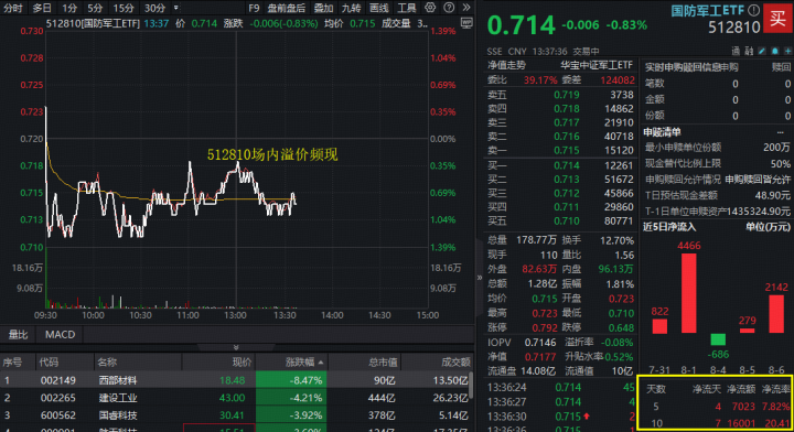 尽管行情回调,512810场内人气不减,溢价频现,截至发稿成交额超1.28亿元。昨日该ETF大涨区间,尾盘获2142万元净申购,近10日累计吸金超1.6亿元,最新基金规模历史首次突破10亿元大关,年内增幅超83%。